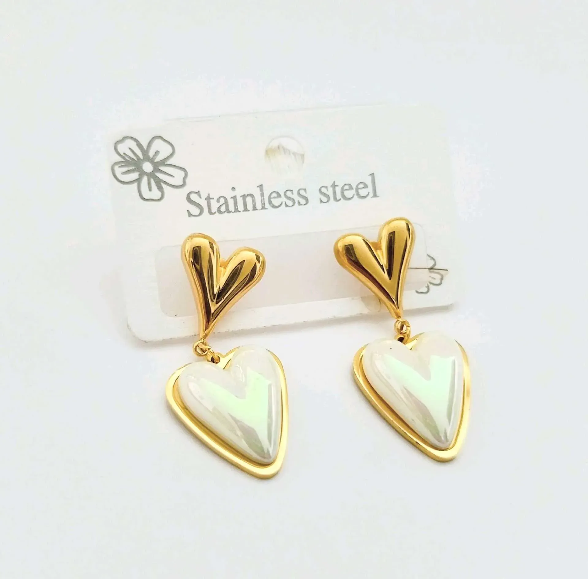 Estos hermosos aretes en forma de corazón dorados son el complemento perfecto para cualquier ocasión. Hechos de acero inoxidable, son duraderos y resistentes al desgaste. Añade un toque de elegancia y estilo a tu look con estos aretes únicos.